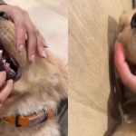 In the video, you can see that the Golden Retriever’s dad is fully committed to the massage. You can’t call this casual petting. This is healing with intention. We’re talking face-lifting motions. Gentle forehead strokes, like he’s erasing stress Bowie never actually had. Bowie doesn’t move. He just lets it happen. Trusts the process. At one point, his ears fold and stretch like warm dough, and he looks like he might actually ascend.