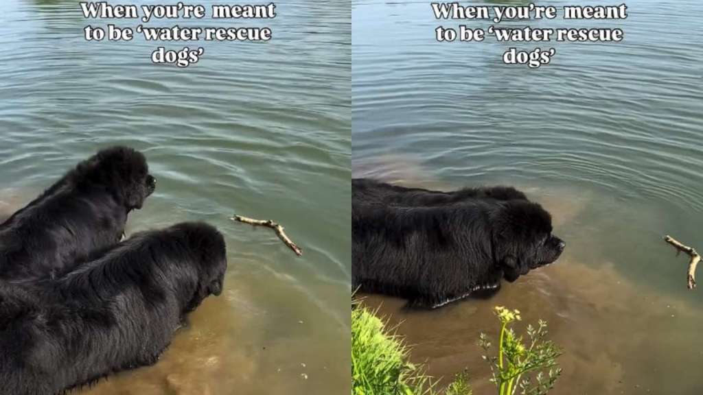 In the video, one of them first reaches out a paw. But it just nudges the branch further into the lake. The dogs in the video look genuinely confused as to why the stick isn’t coming back to them. Their mom says they have the feet for it, but these furbabies are not in the mood to swim. It’s just too much effort for a random afternoon.