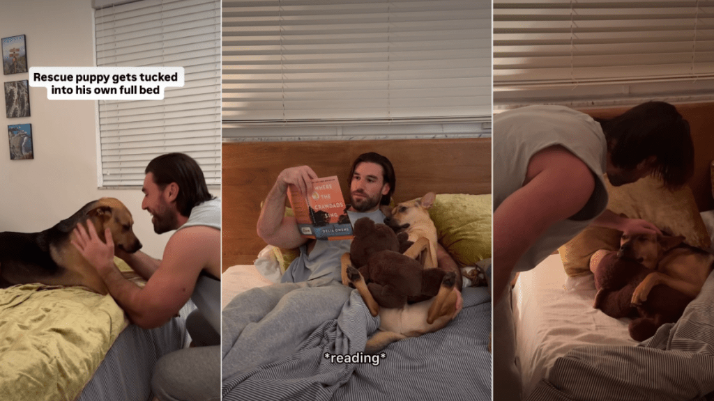 Mike walks in with the supplies. Cactus is already on the mattress, and his whole vibe is that of being ready for sleep. He gets up and heads right for his dad. “Cactus loves his bedtime routine,” Mike explained. He reads to him, and the story puts him to sleep every single time. And it’s true. In the video, the rescue pup gets heavy eyes almost immediately. He lets out a little sigh. Then he curls up with that teddy.