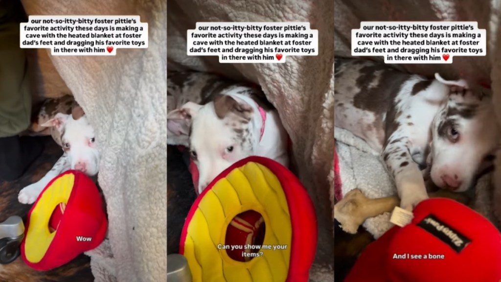 Adam is trying to stay productive, but his foster puppy has a much cozier plan for the afternoon. Piglet is a tiny Pit Bull resident at @wethreepitties in North Carolina. And he has officially taken over the space under the desk. Most dogs just lie on a rug. But this foster puppy found a heated blanket and has turned it into a literal cave at Adam’s feet in this video. Roni, his foster mom, is filming the whole situation because it is just too cute. She is a volunteer who has seen it all. But a puppy building a fortress is a first.